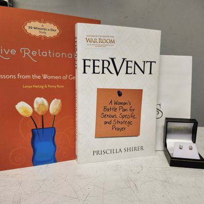 Description: Pair of earrings, Fervent Prayer book and Living Relationally Devotional for Women