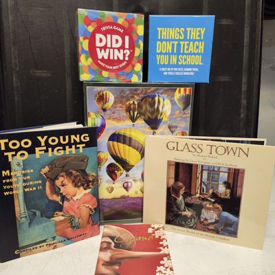 Description: Glasstown, Cyrano and Too Young To Fight books, 1000 piece puzzle and Things They Don’t Teach You and Did I Win? Trivia games